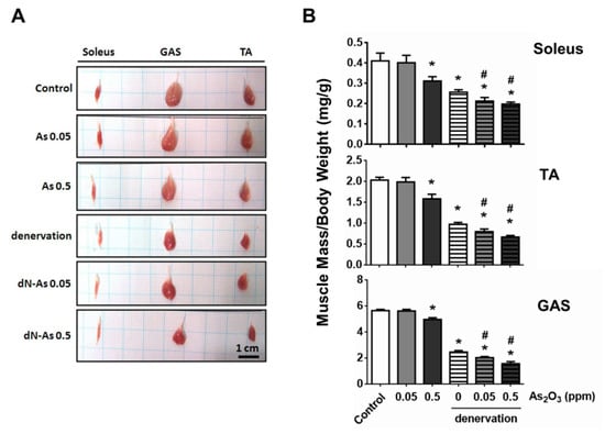 Male 6-week-old Institute of Cancer Research (ICR; CD1) mice were provided by the Animal Center of the College of Medicine, National Taiwan University (Taipei, Taiwan). The ethical review committee of the College of Medicine, National Taiwan University approved this animal study. The animal experiments were performed according to the regulations of Taiwan and National Institutes of Health (NIH) guidelines on the care and welfare of laboratory animals. The animals were humanely treated with regard to the alleviation of suffering. Mice were housed in the standard mouse microisolator cages with aspen chip bedding under controlled conditions (22 ± 2 ℃, 12 h light/dark cycles). All mice were given a standard chow diet (LabDiet #5053) and water ad libitum. There was a one-week acclimation for all mice. Mice with or without muscle denervation were exposed to As2O3 0.05 or 0.5 ppm through drinking water for 4 consecutive weeks (n = 6 mice/group). The selection of compound doses and periods of study was according to our previous studies [8,18] and our preliminary test. The As2O3-containing drinking water was freshly prepared every 3 days to prevent or minimize As2O3 oxidation.