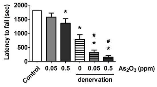 To evaluate muscle function, we further observed the endurance of skeletal muscles with muscle fatigue using the rotarod performance test. As shown in Figure 3, the latency to fall on the rotarod apparatus was slightly but significantly shortened in the As2O3 (0.5 ppm)-exposed normal mice, and was markedly and significantly shortened in the denervated mice with or without As2O3 treatment. The latency to fall in the denervated mice with As2O3 (0.05 and 0.5 ppm) treatment was significantly shorter than that in the denervated mice alone (Figure 3). Especially, the denervated mice with As2O3 (0.05 and 0.5 ppm) treatment showed extreme fatigue after 5 min of the test (Figure 3).