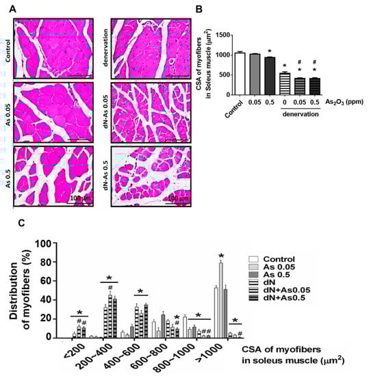 A decrease in the fiber cross-sectional area occurs in response to the loss of muscle mass which represents muscle weakness [23]. We next observed and calculated the cross-sectional area of muscle fibers. The soleus muscle fiber atrophy was observed by hematoxylin and eosin staining (Figure 4A) and cross-sectional area reduction (Figure 4B), which performed a leftward shift in the representative frequency distribution histogram (Figure 4C) in the As2O3 (0.5 ppm)-treated normal mice and the denervated mice with or without As2O3 (0.05 and 0.5 ppm) treatment. The As2O3 (0.05 and 0.5 ppm) exposure in combination with denervation treatment significantly enhanced the reduction in the cross-sectional area, which performed a leftward shift in the representative frequency distribution histogram in soleus muscle as compared to both denervation alone and As2O3 alone (Figure 4).