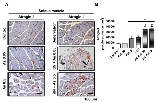Effects of As2O3 on the immunohistochemical change of Atrogin-1 expression in soleus muscles of mice with or without denervation. As2O3 (0.05 and 0.5 ppm) exposure from drinking water for 4 weeks in normal mice or denervated mice. (A). The representative immunohistochemical images for the expression of Atrogin-1 in the soleus muscles isolated from As2O3-treated mice with or without denervation were shown. Scale bar = 100 μm. (B). The quantitative analysis of immunohistochemistry was shown. Data are presented as the mean ± SEM (n = 6 of each group). * P < 0.05 compared to the control group; # P < 0.05 compared to the denervation group.