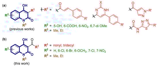 4-Hydroxy-2-quinolone analogs: (a) Examples of the structure–activity relationship investigated in previous works; (b) novel 4-hydroxy-2-quinolone analogs bearing alkyl side chain at C-3 and various types of substituents on C-6 and C-7 positions (this work).
