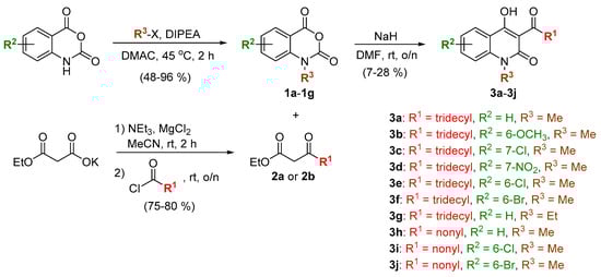 The 4-hydroxy-2-quinolone analogs in this work were synthesized following a three-step protocol starting from isatoic anhydrides with various substituents on the aromatic ring (Figure 2). First, the alkylation of isatoic anhydrides was performed using either methyl iodide or ethyl iodide as the alkylating agents and N,N-diisopropylethylamine (DIPEA) as a base, leading to the formation of N-alkylated isatoic anhydrides (1a–1g) in moderate to excellent yields [22]. Next, β-ketoesters (2a and 2b) bearing long alkyl chains such as nonyl and tridecyl groups were synthesized by the reaction between ethyl potassium malonate and the appropriate acid chlorides mediated by MgCl2 and triethylamine in good yields [23]. Finally, the condensation between 1a–1g and 2a or 2b was achieved using NaH as a base, yielding the analogs of 4-hydroxy-2-quinolone (3a–3j) in relatively low yields [24]. The structures of all the synthesized 4-hydroxy-2-quinolone analogs have been confirmed by several spectroscopic techniques such as 1H NMR, 13C NMR, IR, and HRMS. It is worth noting that these compounds show a characteristic pattern in 13C NMR: A signal at around δ 209 ppm indicating the carbonyl group on the side chain, and a set of signals at 174 and 161 ppm indicating C-4 and C-2 of the quinolone ring, respectively.