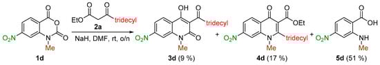 In order to gain insight into the reason behind the poor yield of the final step, the reaction between 1d and 2a for the synthesis of 3d was thoroughly investigated (Figure 3). The isolation and characterization of byproducts revealed that, apart from the desired 4-hydroxy-2-quinolone analog 3d, which were obtained in only 9%, two additional products also occurred: 1,4-Dihydroquinoline-3-carboxylate analog 4d, which is a structural isomer of the desired product, and the 2-aminobenzoic acid 5d were obtained in 17% and 51%, respectively. The generation of the two possible isomers, 3d and 4d, has been documented by Coppola and Hardtmann [25], demonstrating that the selectivity of such transformation highly depends on the nature of the methylene species, which is the β-ketoester 2a in this case. The formation of a large amount of 5d could be caused by the hydrolysis of the isatoic anhydride 1d, hence indicating the presence of water in the reaction. Although several attempts were made to exclude the moisture from the reaction, the yield of 3d was not significantly improved.