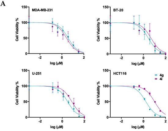 Next, the cytotoxicity and selectivity of the most active compounds, 4g and 4i, were determined in a panel of cell lines, including the normal cell lines, HMECs, and cancer cell lines, BT-20, U-251, and HCT116, as shown in Figure 2 and Table 3. Compound 4g had antiproliferative efficacy in the BT-20, U-251, and HCT116, with IC50 values of 5.32, 7.64, and 2.68, respectively. In contrast, compound 4i had IC50 values ranging from 10–25 µM. The results indicated that although compound 4g is more potent than compound 4i in the three cancer cell lines, compound 4i is more selective for the cancer cells than the normal cells.