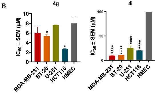 The efficacy and selectivity of 4g and 4i in MDA-MB-231, BT-20, U-251, and HCT116, and compared to the normal cell line, HMEC (A) the viability curves for cancer cells (MDA-MB-231, BT-20, U-251, HCT116), and the normal cell line, HMEC; (B) the IC50 values of 4g and 4i for these cell lines are also compared to the normal cell line. Cell survival was determined using the 3-(4,5-dimethylthiazol-2yl)-2,5-diphenyltetrazolium bromide (MTT) assay. The IC50 values are represented as the means ± SD of three independent experiments performed in triplicate with * p < 0.05, **** p < 0.0001 vs. control group.