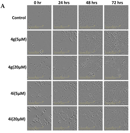 Apoptosis, a type of programmed cell death, is one of the major mechanisms by which chemotherapeutic drugs produce their therapeutic efficacy [43]. Morphologically, apoptosis is characterized by cellular shrinkage, which is accompanied with nuclear chromatin condensation and fragmentation followed by blebbing of the plasma membrane. This leads to the formation of small apoptotic bodies that have an intact cellular membrane and unaltered organelle integrity. These bodies are then released in the extracellular environment and removed by the process of phagocytosis [44,45]. Apoptosis can occur by two pathways: The extrinsic pathway and intrinsic pathway. In either pathway, when the cell is exposed to certain extrinsic or intrinsic stimuli, the integrity of the inner mitochondrial membrane of the cell is compromised, resulting in the loss of the mitochondrial membrane potential, and causing the release of several apoptotic factors, including cytochrome c [46,47]. Numerous studies indicate that during apoptosis, phosphatidylserine (PS), in the cytoplasmic side of the plasma membrane, is translocated to the extracellular cell surface [48]. The flipped anionic PS binds to the Ca2+-dependent phospholipid-binding protein, annexin V [49]. We discovered and reported several potent apoptosis-inducing compounds [50,51,52,53,54,55,56,57]. In this study, the result of our morphological studies in MDA-MB-231 cells after incubation with our lead compounds, 4g and 4i, indicated that apoptosis was occurring (Figure 3A). At a concentration of 20 µM, both compounds decreased the number of adherent MDA-MB-231 cells and induced cellular shrinkage. The cells were rounded and loosely attached, and apoptotic bodies were present. Similarly, the incubation of MDA-MB-231 cells with compounds 4g or 4i for 24 h produced a significant loss of the mitochondrial membrane potential. For compound 4g, the population of cells undergoing apoptosis increased from 14.30% at 0 µM to 26.56% and 58.05% at 5 and 10 µM, respectively (p value < 0.0001; Figure 3B,C). Compound 4i also produced a significant shift in the apoptotic cell population in quadrant II, from 14.78% at 0 µM to 32.25% and 42.56% at 5 and 10 µM, respectively (p value < 0.0001, Figure 3B,C). Cell cycle analysis indicated that compounds 4g and 4i produced a significant disruption in the cell cycle of MDA-MB-231 cells (Figure 3D). Data obtained using flow cytometry indicated that, when incubated with vehicle alone, MDA-MB-231 cells had a normal cell cycle (5.43%, 83.4%, 4.63%, and 4.46% in the subG1, G1, S, and G2 phases, respectively). However, incubation of MDA-MB-231 cells with compound 4g resulted in a significant shift towards the G2 phase (59.12% and 54.13% for 5 and 10 µM, respectively (p value < 0.0001, Figure 3E).