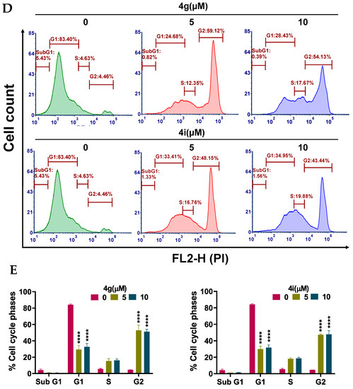 MDA-MB-231 cells were plated into 6-well plates at 2.5 × 105 cells/well. The cells were incubated with 0, 5, or 10 μM of compounds 4g or 4i and incubated for 12 h. Next, the cells were trypsinized with 0.05% trypsin, 2.21 mM EDTA, 1×, washed, counted, and resuspended in 1 mL of ice-cold PBS. The cells then were stained with propidium iodide (PI) dye and incubated for at least 15 min. The distribution of the cells in each cell cycle phase for the different concentrations was measured using a BD Accuri™ C6 flow cytometer from BD Biosciences (Becton-Dickinson, San Jose, CA, USA) and analyzed using FCS Express 5 plus De Novo software (Glendale, CA, USA).