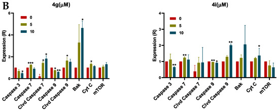 The effect on apoptosis induction at different concentrations of 4g and 4i in MDA-MB-231 cells. (A) Western blots for the proteins caspase 3, caspase 7, cleaved caspase 7, caspase 9, cleaved caspase 9, Bak, cyt C and mTOR following incubation with 4g and 4i at 0, 5, or 10 µM. The values of the proteins were normalized to β-actin levels. (B) Histograms summarizing the levels of each protein are also shown. All the data are presented as the means ± SEM of three independent studies with * p < 0.05, ** p < 0.01, *** p < 0.001 vs. control group. Cleaved is abbreviated as Clvd.