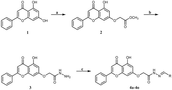 The target compounds (4a–4o) were prepared according to Scheme 1, starting from the commercially available chrysin, using previously published synthetic procedures [29]. Briefly, chrysin was added to methyl 2-bromoacetate at a low temperature in the presence of K2CO3, yielding the desired alkylation product 2. The conversion of ester 2 into hydrazide 3 was accomplished using 80% hydrazine hydrate and a few drops of hydrochloric acid at low temperature. 1H and 13C NMR data confirmed the formation of hydrazide 3 as a pure single product. Target compounds (4a–4o) were obtained by adding hydrazide 3 to an appropriate aldehyde in the presence of a catalytic amount of hydrochloric acid at room temperature. All analogues gave adequate analytical and spectroscopic data, which were in full accordance with their structures. 1H and 13C NMR spectra showed that compounds 4a–4o existed as geometrical isomers (E/Z isomers). The E:Z ratio for each compound was determined from 1H NMR spectra utilizing the integration of the neat methylene group peaks that appeared as two separated singlets for each isomer. Target compounds were analyzed using SwissSimilarity (Swiss Institute of Bioinformatics, Lausanne, Switzerland). Compounds 4a–4j and 4n–4o were the most structurally similar to apigenin, a flavonoid similar to chrysin. The physicochemical properties of the compounds (4a–4o) are shown in Table 1.
