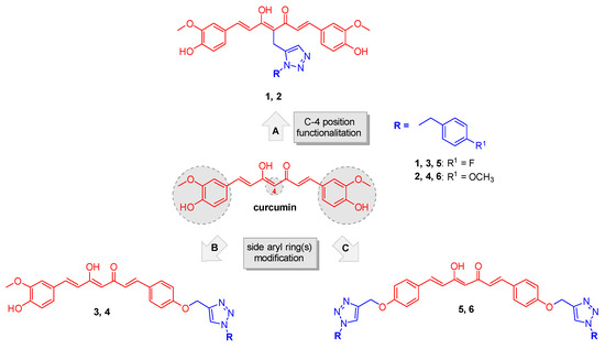Based on these considerations, a properly substituted benzyl 1,2,3-triazole structural unit was introduced into different positions of the curcumin scaffold and a small library of analogues was designed and synthesized (routes A, B and C, Figure 1). This strategy encompassed three main structural rearrangements: as a first step, by retaining the whole curcumin structure, functionalization of the central position of the heptatrienone tether was performed (route A, analogs 1 and 2); then, by maintaining the unmodified central linker, modifications progressively involved the aryl side portions of the parent synthon, i.e., in route B one vanillin-function was kept (analogs 3 and 4), whereas in route C both the lateral moieties were decorated with the selected triazoles (compounds 5 and 6). These diversely arranged curcumin analogs 1–6 allowed exploring the chemical space around the main skeleton, in the light of drawing the essential features for achieving an improvement of the pharmacological profile, in terms of biologic and physicochemical properties.