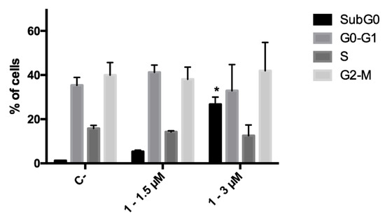 Since during the cytotoxicity assays a decrease in the number of cells was noticed for compound 1, the ability of this derivative to affect cell proliferation was investigated, and its effect on cell-cycle progression was analyzed. CCRF–CEM cells were treated with 1.5 and 3.0 μM concentrations of 1 for 24 h; at the end of the treatment, no cell-cycle block was recorded at any tested concentration. However, as foretold from cytotoxicity experiments, cell death proved to be the primary mechanism of action of the antitumor potential of analog 1. Indeed, a significant increase in the fraction of the subG0 phase, which represents the fraction of cells with fragmented DNA, was recorded (Figure 3).