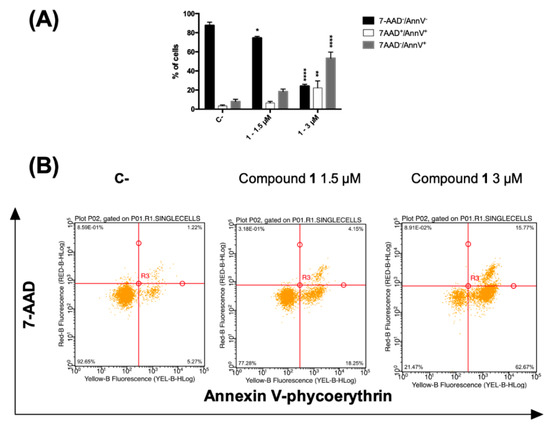 A loss in plasma membrane asymmetry has been recognized as an early event in dead cells, accompanied by surface exposure of phosphatidylserine (PS) residues, whereas the integrity of the membrane remains unhampered. Surface exposed PS can be detected by its affinity for the phospholipid binding protein annexin V (AV) [32]. On the contrary, both late apoptotic and necroptotic cells suffer the loss of membrane integrity, resulting thus permeable to vital dyes namely the DNA intercalator 7-amino-actinomycin (7-AAD) regarded as marker of membrane integrity [33]. Accordingly, to differentiate cells undergoing early cell death from late cell death (i.e., apoptotic and necroptotic ones), AV/7-AAD binding assay, followed by flow cytometry analysis, was performed allowing to identify cells in the early cell death stage (7AAD−/AV+), late cell death stage (7AAD+/AV+) and completely dead cells (7AAD+/ AV−) [34]. CCRF–CEM cells were treated with 1.5 and 3 µM concentrations of compound 1 for 24 h and stained by using AV and 7-AAD. In general, an increase in the fraction of AV-positive cells was observed. At the highest tested dose, the percentage of cells at the early stages of cell death (AV+/7-AAD−) was 53.4. However, 22.3% were the cells in the late stages of cell death together with necrotic cells (AV+/7-AAD+), compared to 8.0% and 3.3%, respectively, recorded for untreated cells (Figure 4A).