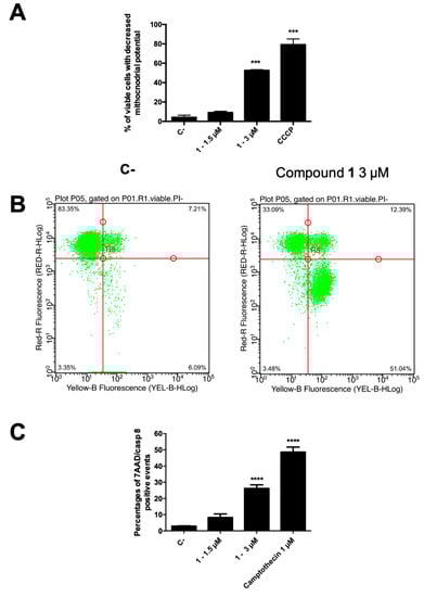 In normal cells, the mitochondrial transmembrane potential (MTP, ΔΨm) plays a key role in preserving the function of the respiratory chain, aimed at ATP generation. During apoptosis, MTP disruption occurs, leading to disturbance of the mitochondrial outer membrane permeabilization and collapse of the electrochemical gradient across the membrane [38]. Thus, to evaluate the involvement of the intrinsic pathway, the degree of MTP reduction on CCRF–CEM was determined. The cells, after treatment with compound 1 at 3 µM, were stained by using the membrane permeable lipophilic cation 1,1′,3,3,3′,3′-hexamethylindodicarbo-cyanine iodide DiIC1(5) and its mitochondria level was determined by a flow cytometry analysis. In apoptotic cells, a reduced fluorescence intensity is the indication of MTP disruption, due to the localization of the dye into the cytoplasm. Figure 5A shows the percentage of viable cells suffering a loss of MTP after 1.5 and 3 µM treatment (24 h) with compound 1. In particular, at 3 µM, 55.9% of 1-treated cells showed a loss in MTP, clearly demonstrating the involvement of mitochondria pathway-mediated cell death in its anticancer effect. In accordance, around 95% of them were in the early cell death phase, as indicated by AV+/7-AAD− assay outcome (Figure 5B).
