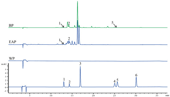 The HPLC chromatogram of standards was given in Figure 1, and the mixed standards were rutin (1), luteolin-4′-O-glucoside (2), apigenin-7-O-glucoside (3), luteolin (4), quercetin (5), and apigenin (6). Three compositions were identified in three phases by matching their retention times against those of the standards (Figure 1), such as rutin (1), luteolin-4′-O-glucoside (2) and quercetin (5). No composition in the mixed standard was detected in WP (Figure 1).