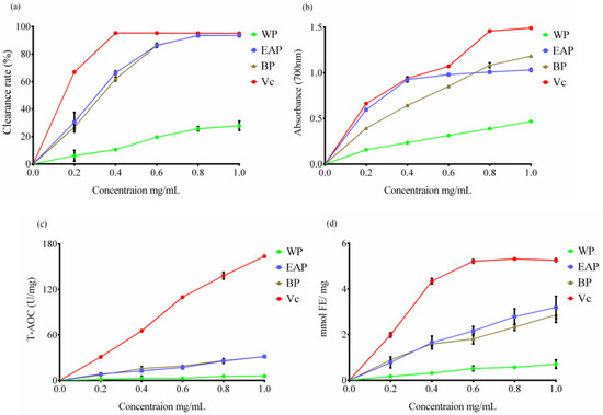 An ascending absorbance meant a promoting total reducing power. Different extraction phases had certain total reduction capacity, showing a good dose-effect relationship with the increasing of sample concentration. As shown in Figure 2b, the absorbance of EAP and BP was higher than WP but lower than Vc. Three phases all had certain total antioxidant capacity, but much lower than positive control Vc (Figure 2c). When the concentration reached 1.0 mg/mL, the total antioxidant capacity of three phases were 5.905 U/mg (WP), 31.62 U/mg (EAP) and 31.42 U/mg (BP), respectively. Ferric ion reducing antioxidant power (FRAP) was widely used to screen high-antioxidant ability substances. The FRAP of EAP was not significantly different from BP, but both of them were significantly higher than WP (p < 0.0001). When the concentration reached 1.0 mg/g, the FRAP of three phases was 0.7114 mmol FE/mg (WP), 3.195 mmol FE/mg (EAP) and 2.862 mmol FE/mg (BP), respectively.