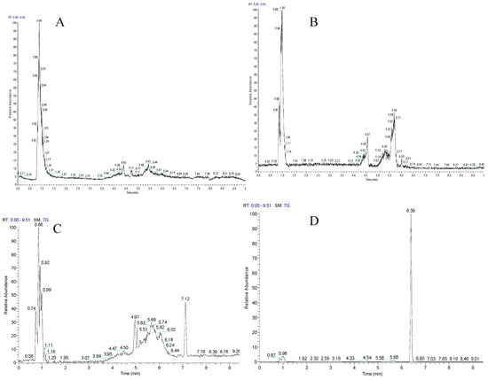 Base peak chromatograms of plasma, after protein precipitation and extraction, analyzed in negative ion mode; (A) blank plasma and (C) treated plasma, for the 302.5–303.5 mass range revealing no interference with tHGA at RT 7.1 min, (B) blank plasma and (D) treated plasma sample showing for the 204.5–205.5 mass range revealing no interference with the IS at RT at 6.3 min. Treated plasma was obtained from rat blood spiked with 0.5 ng/mL of tHGA.