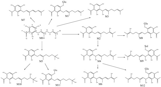 The mass spectral characteristics of tHGA (M0) and its metabolites in the blood, urine, and feces of the experimental animals are summarized in Table 4, and the proposed metabolism pathways of the metabolites are presented in Figure 3.