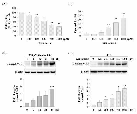 The UB/OC-2 cells in 24-well plates (2 × 104 cells/well) were treated with various concentrations of gentamicin (125–1000 μM) for 48 h, and then MTT solution was added to each well at a final concentration of 0.16 mg/mL for 4 h at 33 °C. The formazan crystals were dissolved in dimethyl sulfoxide (DMSO; Sigma-Aldrich, St. Louis, MO, USA) and, finally, a microplate reader (Infinite 200 PRO Series Multimode Reader; TECAN, Zürich, Switzerland) was used to measure the absorbance of each well at 570 nm.