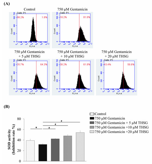 In our previous report, no effect on the survival of UB/OC-2 cells treated with THSG at different concentrations (5–40 μM) for 48 h was seen [31]. To further investigate whether THSG protects gentamicin-treated UB/OC-2 cells from oxidative stress, the levels of ROS were measured by flow cytometry using the indicator dye 2′,7′-dichlorofluorescein diacetate (DCFDA). The fluorescence signal intensity of DCFDA staining was boosted in the gentamicin-treated group compared to the untreated group. The DCFDA staining showed that the THSG treatment decreased the fluorescence intensity markedly in gentamicin-treated cells (Figure 2A). Further, to confirm the effect of THSG on oxidative stress, we measured the antioxidative enzyme activity of superoxide dismutase (SOD). The results showed that the SOD activity in the three THSG-treated groups (treated with 5, 10, and 20 µM of THSG) was significantly higher (42.28 ± 0.72%, 47.90 ± 2.27%, and 54.16 ± 3.32%, respectively) compared to the gentamicin-treated group (31.67 ± 1.75%) (Figure 2B). These results demonstrated that THSG could suppress gentamicin-induced ROS production and increase SOD activity in UB/OC-2 cells.