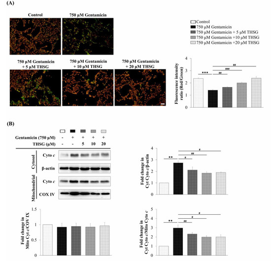 To monitor the changes of mitochondrial membrane potential, fluorescence images of UB/OC-2 cells with 5,5′,6,6′-tetrachloro-1,1′,3,3′-tetraethylbenzimidazolylcarbocyanine iodide (JC-1) dye were observed under a fluorescence microscope. JC-1 dye produces orange-red fluorescence in healthy mitochondria but green fluorescence at low membrane potential. As shown in Figure 3A, the gentamicin only group displayed a relatively low ratio of red to green fluorescence. The THSG in gentamicin-treated groups exhibited an increased ratio of red to green fluorescence compared to the gentamicin-alone group. The results showed that THSG recovered the gentamicin-induced loss of mitochondrial membrane potential. As cytochrome c is a key mediator of the apoptosis pathway, we next evaluated the gentamicin-stimulated cytochrome c release from mitochondria. It was observed that THSG treatment blocked the release of cytochrome c from mitochondria to the cytosol (Figure 3B). Collectively, these results showed that THSG evaded gentamicin-induced oxidation stress and downregulated mitochondria-dependent apoptosis in UB/OC-2 cells.