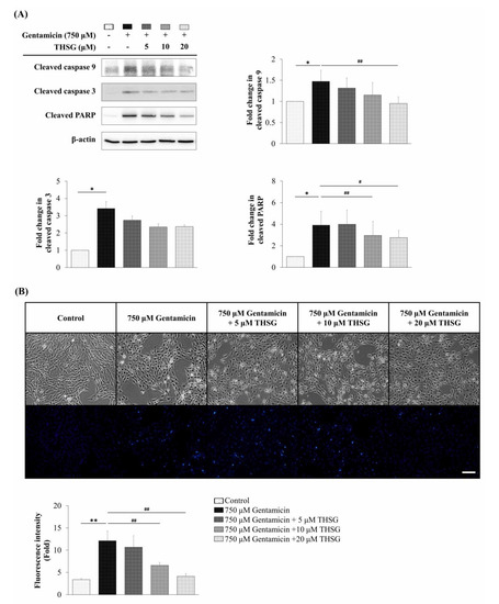To confirm the apoptotic effects of THSG on mitochondrial-dependent apoptosis, the protein expression of cleaved caspase 9, cleaved caspase 3, and cleaved PARP were analyzed by western blotting. The results showed that THSG suppressed the cleaved levels of caspase 9, caspase 3, and PARP after gentamicin treatment (Figure 4A). Additionally, the nuclear staining using Hoechst 33258 dye showed a lower fluorescence intensity of Hoechst 33258 in the THSG-treated groups than in the gentamicin-alone group (Figure 4B) indicating reduced nuclear condensation.