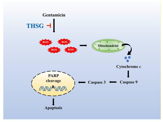 Excess ROS levels may contribute to mitochondrial damage, including impairment of RNA translation, protein synthesis, and mitochondrial membrane permeability, and cause mitochondrial-dependent apoptosis [49,50,51]. We showed that ROS was significantly increased after 2 h of exposure to gentamicin, and THSG reduced the gentamicin-induced ROS generation (Figure 2A). The present study depicts early ROS production in gentamicin-induced toxicity that could have been triggered by lysosomal membrane permeabilization, followed by mitochondrial dysfunction [52]. Studies have shown that gentamicin causes apoptosis through the mitochondrial-dependent intrinsic apoptotic pathway but not the extrinsic apoptotic pathway [53,54,55]. Furthermore, cytochrome c, a caspase activator, is used to characterize the mitochondrial-dependent apoptotic pathway when released from mitochondria to cytosol, followed by the activation of caspase 9, caspase 3, and PARP. The nuclear enzyme PARP is involved in the DNA damage response [56]. Apoptotic cells show conspicuous changes like nuclear condensation, cell shrinkage, membrane blebbing, and DNA fragmentation. In our study, treatment with THSG suppressed the disruption of the mitochondrial membrane potential, restored cytochrome c release, and downregulated the mitochondrial-dependent apoptotic pathway in gentamicin-treated UB/OC-2 cells (Figure 3 and Figure 4). Moreover, we observed that THSG decreased the level of apoptotic cells and cytotoxicity in gentamicin-induced cell damage (Figure 5). These results suggest that THSG might protect mouse cochlear UB/OC-2 cells from gentamicin-induced cell death by inhibiting ROS generation and downregulating the mitochondrial-dependent apoptosis pathway (Figure 6), but further animal experiments are necessary to confirm the otoprotecitive effects of THSG.
