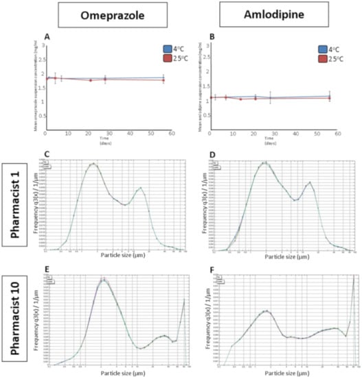 The stability profile of extemporaneously prepared (A) omeprazole and (B) amlodipine suspensions over a 56-day period stored at 4 °C and 25 °C. Statistical significance was determined using a Wilcoxon Signed Rank test, n = 5. Differences in the particle size distribution of suspensions prepared by pharmacist 1: (C) omeprazole, (D) amlodipine, and pharmacist 10: (E) omeprazole, (F) amlodipine.