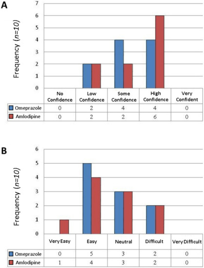 All pharmacists (n = 10) completed and returned the survey. The ten participants consisted of five female and five male pharmacists; all had a background in community and/or hospital pharmacy. The pharmacists were first asked whether or not they had prepared the particular formulation in the past. Four pharmacists had previous experience preparing omeprazole suspensions in the past, whilst one pharmacist had previously prepared the amlodipine suspension. Pharmacists were asked to rate their overall confidence in the final product and responses were scaled 1–5, where 1 = no confidence and 5 = very confident.