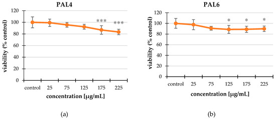 The effect of the PAL4, PAL6, and PAL7 on the cell viability of the HT-29 line studied using a neutral red (NR) uptake assay. The extracts worked in a dose-dependent manner. The values are compared to the control, regarded as 100%; * p < 0.01, ** p < 0.005, *** p < 0.001, one-way ANOVA, Dunnett’s test.