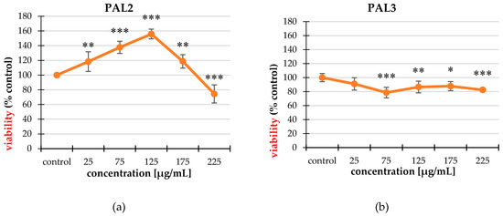 The effect of the PAL3, PAL4, and PAL7 on the cell viability of the CCC 841 CoTr line studied using a neutral red (NR) uptake assay. The extracts worked in a dose-dependent manner. The values are compared to the control, regarded as 100%; * p < 0.01, ** p < 0.005, *** p < 0.001, one-way ANOVA, Dunnett’s test.