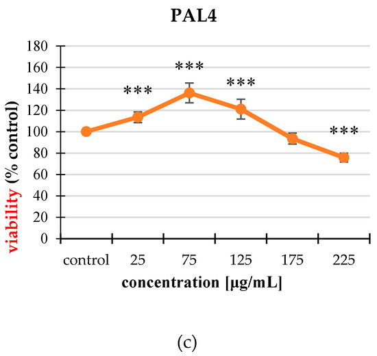 The cytotoxic properties of the tested extracts of the HT-29 line studied using an 3-(4,5-dimethylthiazol-2-yl)-2,5-diphenyltetrazolium bromide (MTT) assay. The most effective extracts were PAL2 (a), PAL3 (b), PAL4 (c). The values are compared to the control regarded as 100%; * p < 0.01, ** p < 0.005, *** p < 0.001, one-way ANOVA, Dunnett’s test.
