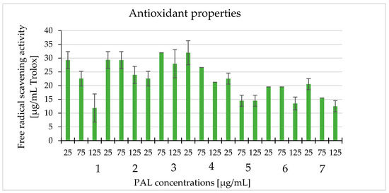 The antioxidant properties of the tested extracts (PAL1–PAL7) at the concentrations 25, 75, and 125 μg/mL with the 2,2-diphenyl-1-picrylhydrazyl (DPPH) radical scavenging method and expressed as Trolox equivalents (μg/mL).