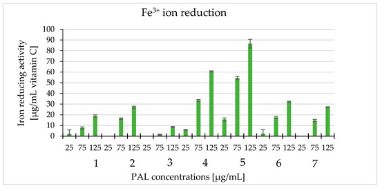 The ability to reduce iron ions of the tested extracts (PAL1–PAL7) at the concentrations 25, 75, and 125 μg/mL with the ferric reducing antioxidant power (FRAP) method and expressed as vitamin C equivalents (μg/mL).