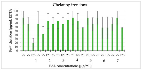 The ability of the tested extracts to chelate iron ions (PAL1–PAL7) at the concentrations 25, 75, and 125 μg/mL expressed as EDTA equivalents (μg/mL).