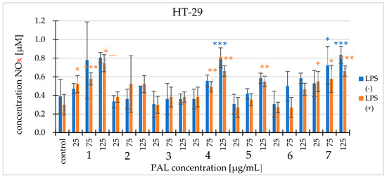 The nitric oxide level was determined using two experimental variants: with and without cells pre-incubated with lipopolysaccharide (LPS). LPS is an endotoxin that occurs in the outer membrane of Gram-negative bacteria walls [11]. Extracts at concentrations of 25, 75, and 125 µg/mL were tested. For both lines, the concentration of nitric oxide produced was higher or at a similar level as in the control. In most cases, a higher NOx concentration occurred in experimental variants without cells preincubation with LPS. There are differences between the lines. In the cancer line, the concentration of nitric oxide increased with increasing concentration, whereas in the non-cancer phenotype line, the concentration could not be observed. PAL7 showed the strongest effect on the HT-29 cells (increased to 0.83 ± 0.09 µM NOx compared to the control (0.39 ± 0.18 µM)), and the most effective against CCD 841 CoTr cells was PAL5 (increase to 0.84 ± 0.16 µM in comparison to the control (0.47 ± 0.16 µM) (Figure 8) and (Supplementary Materials, Figure S5).