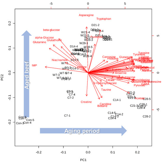 The loading plots of variables, which visualize variables, can be used for understanding metabolic patterns easily [17]. Most of the metabolites were associated with PC1 and were composed of most free amino acids, biogenic amines, and bioactive compounds, except for some free amino acids (asparagine, tryptophan, and glutamine), inosine 5′-monophosphate (IMP), α- and β-glucose, and glutathione (Figure 1). The proportional increase in free amino acids and their derivatives (biogenic amines and bioactive compounds), depending on the aging period, was a well-known result of the aged meat [18]. Biogenic amines such as cadaverine, putrescine, tyramine, and trimethylamine (TMA) commonly increased depending on the aging period, and these compounds are usually considered indicators of freshness in meat samples [19,20]. Moreover, not only IMP and α- and β-glucose are recognized as freshness indicators, but also these metabolites play an important role in meat flavor development during the cooking process [3,21]. In addition to PCA, partial least squares-discriminant analysis (PLS-DA) was performed to separate between groups of observations (R2 = 0.967, Q2 = 0.935). PLS-DA, which is called the supervised method, is similar to PCA, but it can discriminate differences based on each group [16]. In this study, PLS-DA showed a good cumulative explained variation (R2) and predictive ability (Q2), which meant that the different aging methods and their aging period were clearly distinguished based on the polar metabolic characteristics.