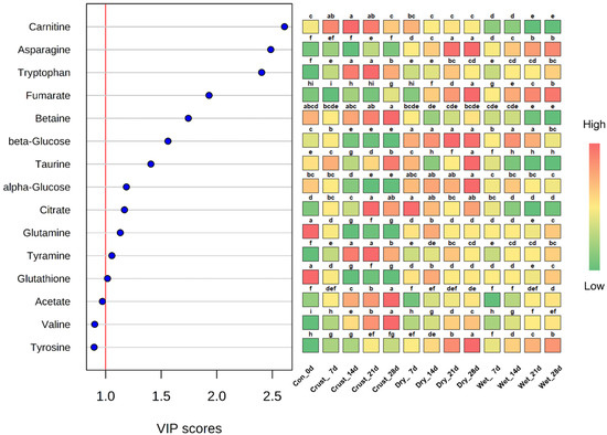 Variable importance in projection (VIP) scores of partial least squares-discriminant analysis (PLS-DA) from the extracts of crust, dry-aged, and wet-aged beef. The colored boxes on the right indicate the relative concentrations of the corresponding metabolites (red, high; yellow, intermediate; green, low). a–i Letters different in the same row indicate a significant difference (p < 0.05).