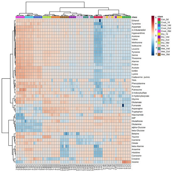 A hierarchical clustering heatmap analysis was performed for the classification between different observations (Figure 3). This method arranges the groups based on the similarity of the datasets and can be easily recognized using a dendrogram and heatmap [23]. As seen in the dendrogram, the greatest differences were shown between the crust and the other groups after the second week. The differences were clearly expressed in the PCA (Figure 1). These noticeable differences in the crust could be attributed to water evaporation and microbial effects [3,8,24]. Among the aged beef, most groups were well clustered by group except for some regions where the first week of dry- and wet-aged beef and the second week of dry-aged beef were mixed and the second and third weeks of wet-aged beef were mixed. Based on the results, the metabolic characteristics were clearly differentiated in the crust and dry-aged beef in the second week. In a previous study, similar results were reported that the unique flavor of dry-aged beef needs to age at least 2 weeks [3].