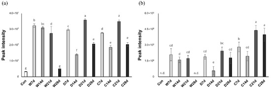 Statistical analysis was performed using the procedure of the general linear model for the comparison of quantified metabolites. Significant differences among mean values were determined by Student–Neuman–Keul’s multiple range test using SAS software (SAS 9.4, SAS Institute Inc., Cary, NC, USA) with a confidence level of p < 0.05. All the experimental procedures were conducted in quintuplicate.