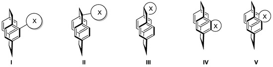Cyclophane chemistry is rapidly growing in the field of stereoselective synthesis with its incorporation into heterocyclic and/or polymer chemistry [1,2,3,4,5,6,7,8]. A great deal of attention is focused on developing new synthetic tools for synthesizing functionalized [2.2]paracyclophanes. Substituted [2.2]paracyclophanes can also serve as chiral templates and/or as auxiliaries [9]. The synthesis and application of heterocycles based on [2.2]paracyclophane [10,11] can be organized into five structural classes (Figure 1): heterocycle derived by paracyclophanyl group (type I), heterocycle derived by bridge (type II), heterocycle fused to ethano bridge (type III), fused heterocycle to the benzene moiety (type IV), and heterocycle between the two benzene rings of paracyclophane (type V).