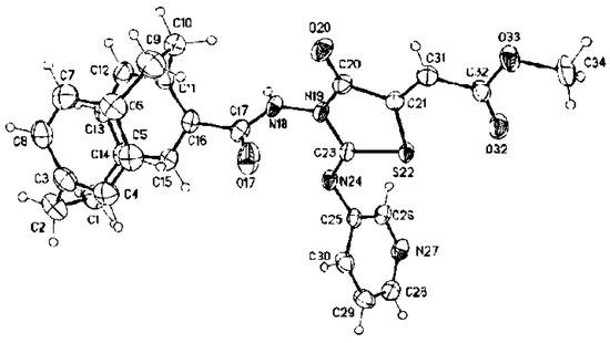 The X-ray structure analysis of compounds 2a,b,d strongly confirmed the proposed structures as shown in Figure 4, Figure 5 and Figure 6, respectively. One can note that the dihedral angle of CS–NH–NH–CO was nearly 90°, and that angle was also seen in an example reported in reference [32].