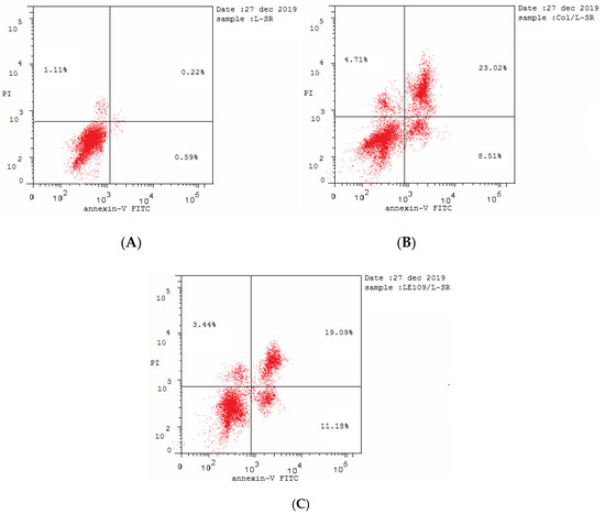 This prevents DNA-damaged cells from entering mitosis and allows for the repair of DNA that was damaged in late S or G2 phases prior to mitosis (Table 5). Induction of cell-cycle arrest is a common mechanism proposed for the cytotoxic effects of anticancer drugs containing paracyclophane/thiazole derivatives. The analysis indicated that leukemia SR cells treated with compound 3a showed significant growth arrest at the G2/M phase compared to control cells, where the S-phase progression of SR cells was substantially delayed (Figure 10). The annexin V/PI flow cytometry of SR cells was repeated three times after treatment with the IC50 value (1.11 µM) of 3a, which showed an increase in percentage of the necrotic cells in late apoptosis to 19% (upper right quadrant of the cytogram) (Figure 11). Hence, compound 3a showed a considerable ability to dissipate cell membrane integrity, whereas the lower right quadrant illustrating the early apoptotic cells which kept their membrane integrity indicated the ability of 3a to initiate apoptosis.