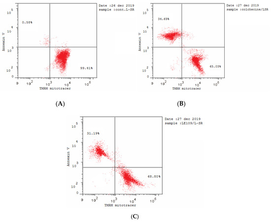 Mitochondria play an essential role in the propagation of apoptosis [33]. It is reported that, at an early stage, apoptotic stimuli are capable of modifying the mitochondrial transmembrane potential (Δψmt). Δψmt was recorded by the fluorescence of the dye JC-1.20. SR cells treated with 3a displayed a non-significant shift in fluorescence compared with control cells, explaining the weak depolarization of the mitochondrial membrane potential. In contrast, colchicine showed significant results (Figure 12). The disruption of Δψmt is associated with the appearance of annexin V positivity in the treated cells when they are in an early apoptotic stage. It is documented that the dissipation of Δψmt is characteristic of apoptosis, and this was indicated with both microtubule-stabilizing and -destabilizing agents in different cell types [34]. Induction of cell-cycle arrest is a common mechanism proposed for the cytotoxic effects of anticancer drugs containing paracyclophane/thiazole derivatives. Mitochondrial membrane depolarization is associated with mitochondrial production of ROS [35]. Therefore, we investigated whether ROS production increased after treatment with the test compounds.