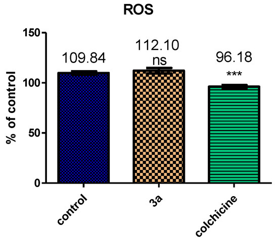 The presented results in Figure 13 show that 3a induced the production of significant amounts of ROS (109.84%) in comparison with control cells and the colchicine reference. This result is compatible with the dissipation of Δψmt described above.