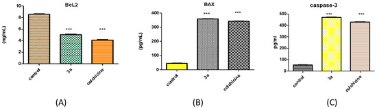 The proteins of the Bcl2 family [39] play a major role in controlling apoptosis through the regulation of mitochondrial processes and the release of mitochondrial proapoptotic molecules that are important for the cell death pathway [40]. Compound 3a caused nearly 7.98-fold upregulation (Table 8), while it showed markedly higher levels of the antiapoptotic Bcl-2 proteins up to 0.59-fold compared to the control untreated cells (Figure 14).