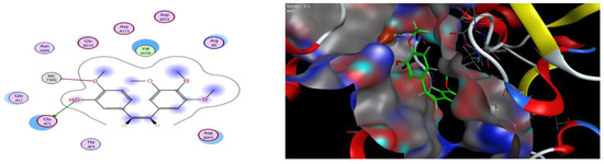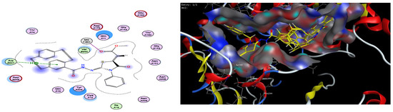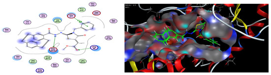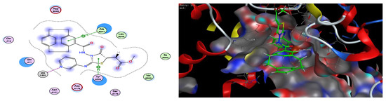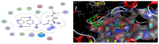 Compounds 3a, 3c, 3d, and 3e exhibited the same interaction as the reference with Mg 601; however, both 3d and 3b showed hydrogen bonding interactions with Glu 71 (Figure 16, Figure 17, Figure 18, Figure 19 and Figure 20). On the other hand, compound 3d possessed greater interactions than the reference with the same amino acids with additional one H–pi bond with Arg 2 (Figure 20); however, compounds 3a and 3c displayed an extra H–pi interaction with Ala 247 (Figure 16 and Figure 18). Compound 3c (Figure 18) did not feature hydrogen binding interactions with the amino acid residue Glu 71, but kept an H–Pi interaction with Tyr 224.