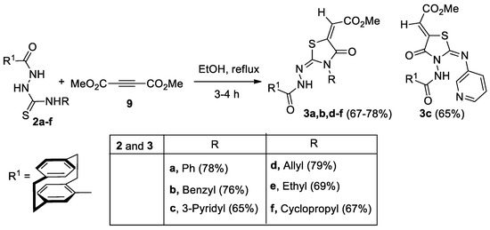 Refluxing 2af with dimethyl acetylenedicarboxylate (9) in EtOH afforded the expected thiazolidinones 3a,b,df in 67%–78% yield together with 3c in 65% yield (Scheme 4).