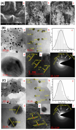 (A) SEM images of Ag NPs and Au NPs synthesized from aqueous extract of oyster mushroom P. sajor-caju. (a) Aqueous extract of oyster mushroom P. sajor-caju; (b) P. sajor-caju mediated synthesized Ag NPs and (c) Au NPs. (B) TEM images and size distribution histogram of biosynthesized Ag NPs (a to f) in which the scale bar represents at 100 nm (a), 50 nm (b), particle size histogram analysis of Ag NPs (c), 10 nm (d), and at 5 nm high-resolution TEM (HR-TEM) image of a single Ag NPs respectively with lattice fringes (e) and SAED pattern (f).; (C) TEM images and size distribution histogram of biosynthesized Au NPs (a to f) at 100 nm (a), at 50 nm (b), particle size histogram analysis of Au NPs (c), at 10 nm (d), at 5 nm HR-TEM image of an Au NPs respectively with lattice fringes (e) and SAED pattern (f).