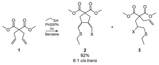 For the purpose of this review, ‘homogenous’ infers the same degree of unsaturation for all reactive sites in the substrate or substrates; i.e., dienes, diynes, trienes, etc. Possibly the earliest example of a cyclization cascade on a homogenous substrate was published by Kuehne et al. in 1977 []. The account details the cyclization of selected dienes with a range of thiyl radical precursors, relying upon radical initiation via photolysis of diphenyl disulfide or thermolysis of benzoyl peroxide. Kuehne and co-workers sought to compare the cyclizations effected by a range of representative thiyl radical species, and thus experimented with the initiator itself, and thermal versus photoinitiation. While they obtained a number of acyclic adducts and complex mixtures of stereoisomers, a number of cyclized products were also identified. The representative example in Scheme 1 shows the cyclization of dimethyl diallylmalonate 1 under a number of reaction conditions, the best of which employed the photolysis of diphenylsulfide in benzene to generate the thiyl radical of ethanethiol. These conditions resulted in the formation of over 90% cyclized product 2, and six minor acyclic adducts. However, the formation of any six-membered cyclization products was ruled out systematically.