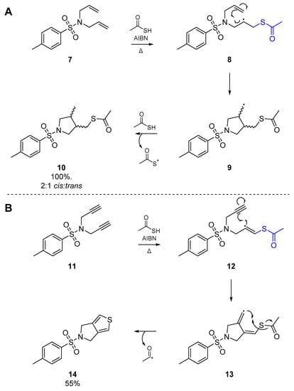 Padwa et al. also reported the addition of an acetylthiyl radical onto another homogenously unsaturated substrate; the corresponding N,N-dipropargylsulfonamide 11 (Scheme 3B). In this case however, a crystalline solid was obtained from the reaction as the major product, which was later identified as the thienopyrrole 14. Following addition of the thiyl radical to the alkyne, the nascent carbon-centered radical cyclizes as shown in Scheme 3. However, this results in formation of a highly unstable vinyl radical intermediate 13, which through an intramolecular homolytic substitution (SHi) extrudes an acyl radical to afford the observed product 14. Indeed, this is one of the few examples of a diyne cyclization via thiyl radicals that one can find in the literature. A second account of diyne reactivity under thiyl radical addition appeared three decades later, in which Agrawal et al. optimized a number of substrates with malonate-type backbones for cyclization to the respective thiophene []. This approach relies on thermolysis of AIBN in toluene with thioacetic acid as the acyl thiyl radical source, and furnished a number of the bicyclic thiophenes, in good yield.
